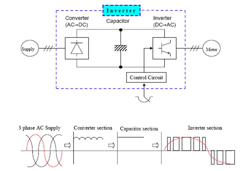 Nguồn điện xoay chiều 1 pha hay 3 pha được chỉnh lưu và lọc thành nguồn 1 chiều bằng phẳng. Công đoạn này được thực hiện bởi bộ chỉnh lưu cầu diode và tụ điện.